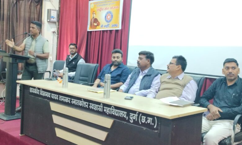 दुर्ग। उच्चतम न्यायालय, नई दिल्ली एवं राज्य शासन के निर्देश के अनुसार राष्ट्रीय सड़क सुरक्षा माह- 2025 का आयोजन कर आम जनता को यातायात नियमों एवं सड़क सुरक्षा के प्रति जागरूकता अभियान चलाया जा रहा है। इसी तारतम्य में परिवहन विभाग दुर्ग द्वारा शासकीय विश्वनाथ यादव तामस्कर स्नातकोत्तर स्वशासी महाविद्यालय दुर्ग में 16 जनवरी 2025 को सड़क सुरक्षा माह के अंतर्गत जागरूकता कार्यक्रम आयोजन किया गया।