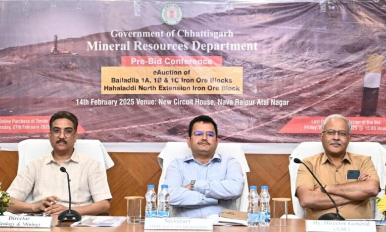 रायपुर। संचालनालय भौमिकी एवं खनिकर्म, छत्तीसगढ़ द्वारा बस्तर के बैलाडीला क्षेत्र के लौह अयस्क ब्लॉकों की नीलामी को लेकर आज नवा रायपुर के न्यू सर्किट हाउस स्थित कन्वेंशन हॉल में ‘प्री-बिड कॉन्फ्रेंस’ का आयोजन किया गया। इस बैठक में देशभर से आए खनन निवेशकों और बोलीदाताओं ने भाग लिया, जहां नीलामी प्रक्रिया, निवेश अवसरों, और खनिज संसाधनों पर विस्तृत चर्चा हुई।