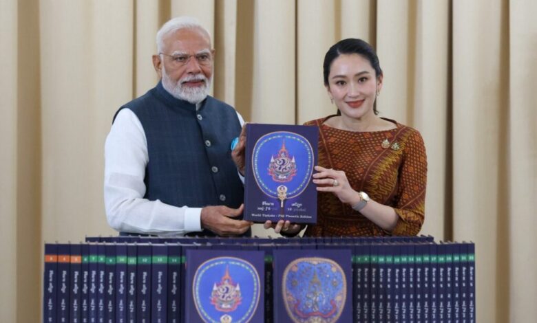 पीएम मोदी ने कहा, मैं थाईलैंड सरकार का आभारी हूं कि मेरी यात्रा के उपलक्ष्य में 18वी शताब्दी की ‘रामायण’ म्यूरल पेंटिंग्स पर आधारित एक विशेष डाक-टिकट जारी किया गया है। प्रधानमंत्री शिन्नावात ने अभी मुझे त्रिपिटक भेंट की। बुद्ध-भूमि भारत की ओर से मैंने इसे हाथ जोड़ कर स्वीकार किया।