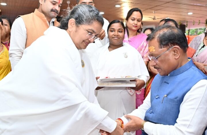 रायपुर। रक्षाबंधन के शुभ अवसर पर प्रजापिता ब्रह्मकुमारी ईश्वरीय विश्वविद्यालय, रायपुर की संचालिका ब्रह्मकुमारी सविता बहन ने मुख्यमंत्री विष्णु देव साय से उनके निवास कार्यालय में सौजन्य भेंट की और उन्हें रक्षा-सूत्र बाँधकर उनके स्वास्थ्य, दीर्घायु और सुखद जीवन की मंगलकामना की।