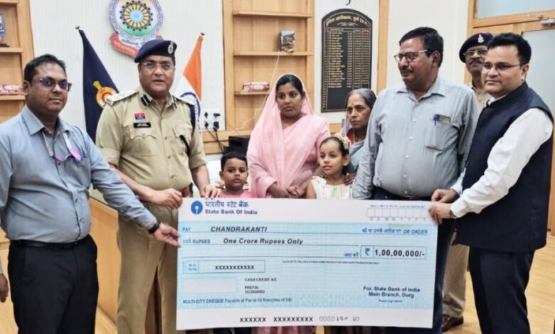 जिसके अंतर्गत सड़क दुर्घटना में पुलिस कर्मी की मृत्यु होने पर दिनांक 20.06.2025 को वरिष्ठ पुलिस अधीक्षक विजय अग्रवाल, एसबीआई के क्षेत्रीय प्रबंधक रूपक मंडल, सेक्टर-1 भिलाई तथा एवं एसबीआई शाखा गंजपारा, जिला दुर्ग के शाखा प्रबंधक राहुल मोदी की उपस्थिति में सड़क दुर्घटना में मृत आरक्षक क्र.1724 उपेन्द्र कुमार तिवारी, जिला दुर्ग की नामिनी माताजी चंद्रकांति तिवारी को मिला 1 करोड़ रूपये का चेक सौंपा गया।